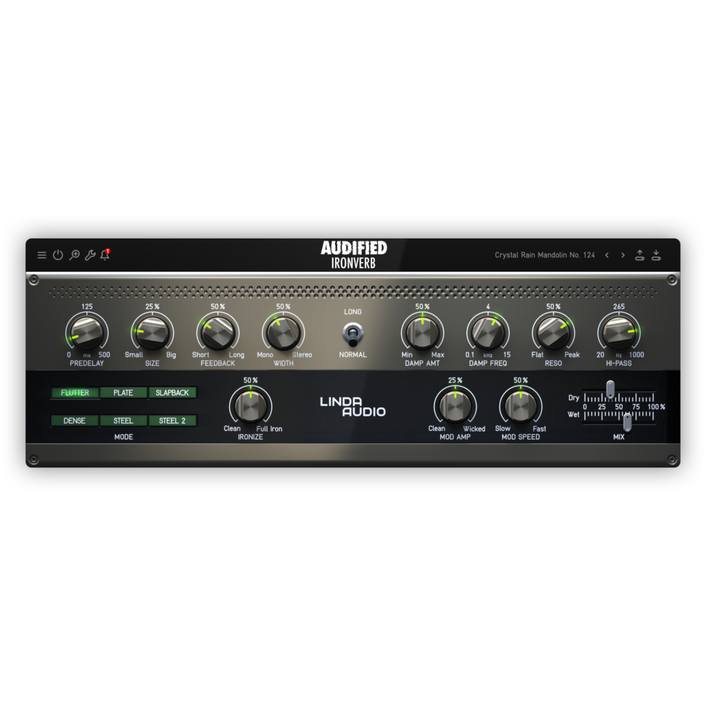 Classic algorithmic reverb with a variety of features and unique Ironize modulation.
